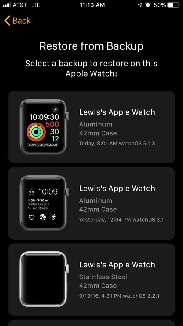 Apple Watch saatinizi yeniden eşleştirdiğinizde, cihazı sıfırdan kurma veya bir yedekten geri yükleme seçeneği gelir. Yedekten Geri Yükle (Restore from Backup) seçeneğini seçin. Ve geri yükleme işlemi için kullanmak istediğiniz yedeklemeyi seçin.