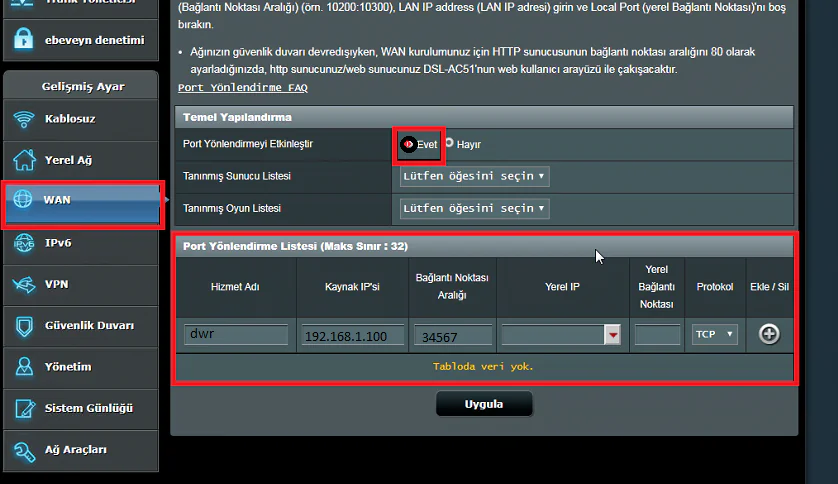 - Bu sekmede port açma (yönlendirme) işlemin yapacağız. Port yönlendirme (açma) işlemi için aşağıdaki adımları uygulayın:
