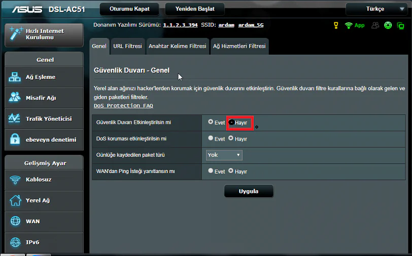 - Açılan sayfada ‘Güvenlik Duvarı Etkinleştirilsin mi?’ bölümünde Hayır seçeneğini işaretleyiniz ve daha sonra alt kısımda bulunan UYGULA seçeneğine tıklayınız. ASUS DSL-AC51 MODEM PORT AÇMA işlemi bitmiştir. Açmış olduğunuz port değerlerini herhangi bir siteden kontrol edebilirsiniz; eğer sorun yaşarsanız yapılan ayarları tekrardan kontrol ediniz.