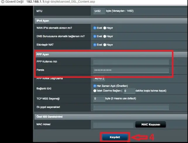 - Son olarak sayfanın alt kısmında bulunan PPP Ayarı bölümünde PPP Kullanıcı Adı ve Parola kısmına internet servis sağlayımız tarafından bizlere verilen internet kullanıcı adımızı ve parolamızı girerek en altta bulunan Kaydet tuşuna basmamızın ardından kurulumu tamamlıyoruz.