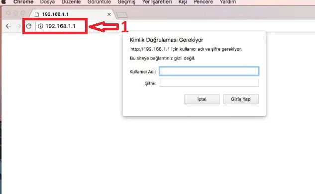 • Tarayıcımız açıldığında modem arayüzüne erişebilmek için adres satırına 192.168.1.1 yazıyoruz ve Enter tuşuna basıyoruz.