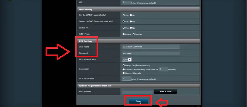 - Açılan sayfada PPP Setting kısmında ADSL kullanıcı adı ve şifre bilgilerinizi yazmış olduğunuz User Name ve Password kutucuklarını göreceksiniz. Bu kutucuklardaki ADSL bilgilerinizi, doğru kullanıcı bilgilerinizi girerek düzenleyip Save butonuna tıklamanız yeterli olacaktır.