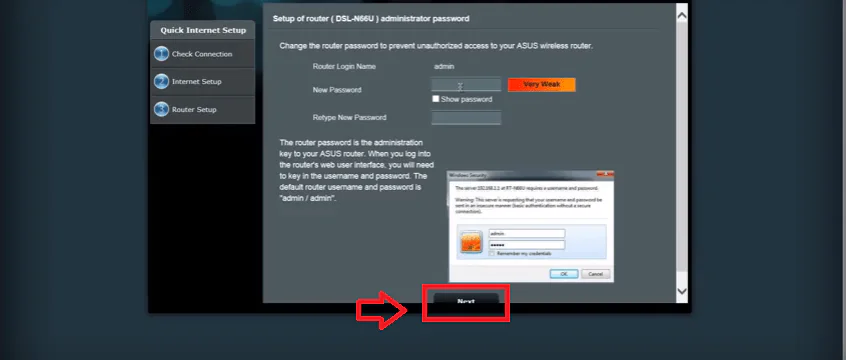 Açılan sayfada modem arayüzüne giriş şifresini değiştirmeniz istenmektedir. New Password ve Retype New Password kutucuklarına, belirlediğimiz şifreyi girelim. Şifreyi belirledikten sonra Next tuşuna tıklayalım