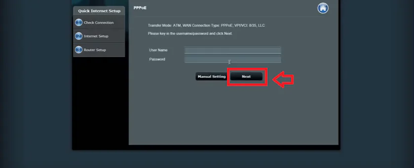 Açılan PPPoE sayfasında User Name ve Password kutucuklarına ADSL kullanıcı adı ve şifre bilgilerimizi yazalım ve ardından Next butonuna tıklayalım.