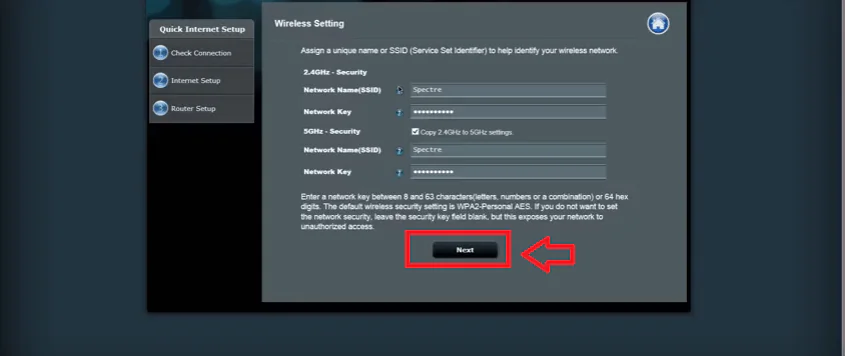 Kablosuz Ağ Adı belirlerken Türkçe karater kullanılmamalı. Şifre ise en az 8 karakter ve en fazla 64 karakter içerecek ve Türkçe karakter içermeyecek şekilde yazalım. İsterseniz, Copy 2.4GHz to 5GHz settings seçeneğini seçerek, 2.4GHz için belirlediğiniz ayarları 5.0GHz band yayını için de ayarlayabilirsiniz. Ayarları yaptıktan sonra Next butonuna tıklayalım.