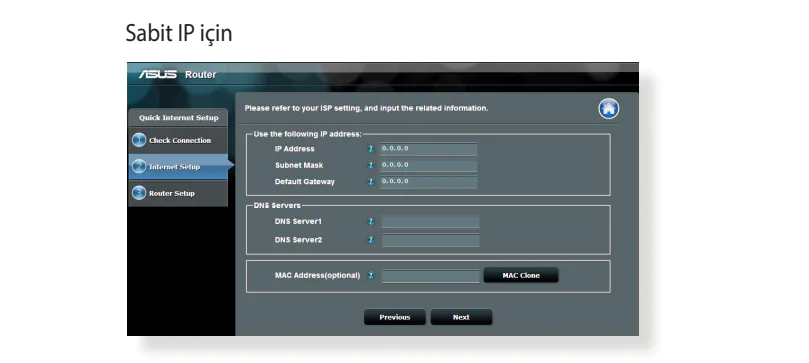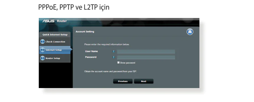 - Kablosuz yönlendirici ISP bağlantı türünüzün Dynamic IP (Dinamik IP), PPPoE, PPTP, L2TP ve Static IP (Statik IP)’den hangisi olduğunu otomatik olarak algılar. Çünkü ISP bağlantı türünüz için gerekli bilgileri girin.