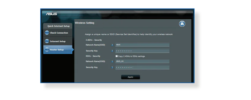 - Kablosuz bağlantı işlemleri için 2,4 GHz veya 5 GHz ağ adını (SSID) ve güvenlik şifresini belirlememiz gerekir. İşlemler yapıldıktan sonra Apply (Uygula) seçin.