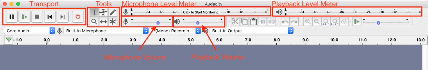 Audacity’yi ilk açtığınızda, en üstte Aktarım (Çal, Durdur vb.), Araçlar ve mikrofon girişi ve oynatma için Ses/Ölçerler dahil olmak üzere bir dizi araç çubuğu göreceksiniz.