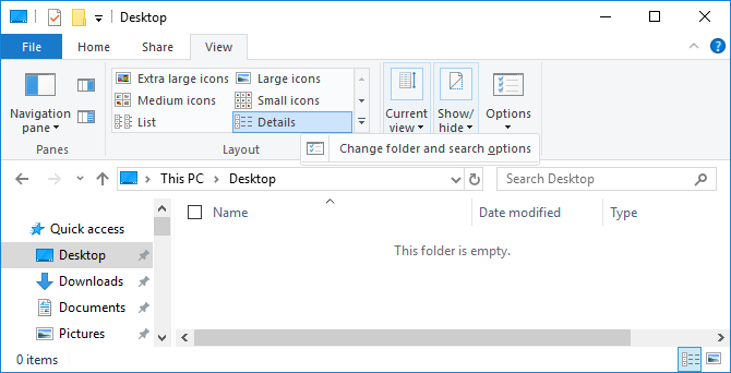 Dosya Gezgini’ni açmak için Windows + E tuşlarına basın. Görünüm> Seçenekler> Klasörü değiştir ve arama seçeneklerine gidin.