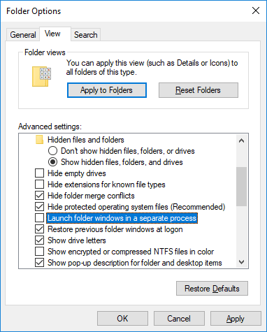 Klasör Seçenekleri penceresinde, “Görünüm” sekmesine geçin ve klasör pencerelerini ayrı bir işlem seçeneğinde bulun. İşaretli olmadığından emin olun. Değişiklikleri kaydetmek için Uygula’yı tıklayın.