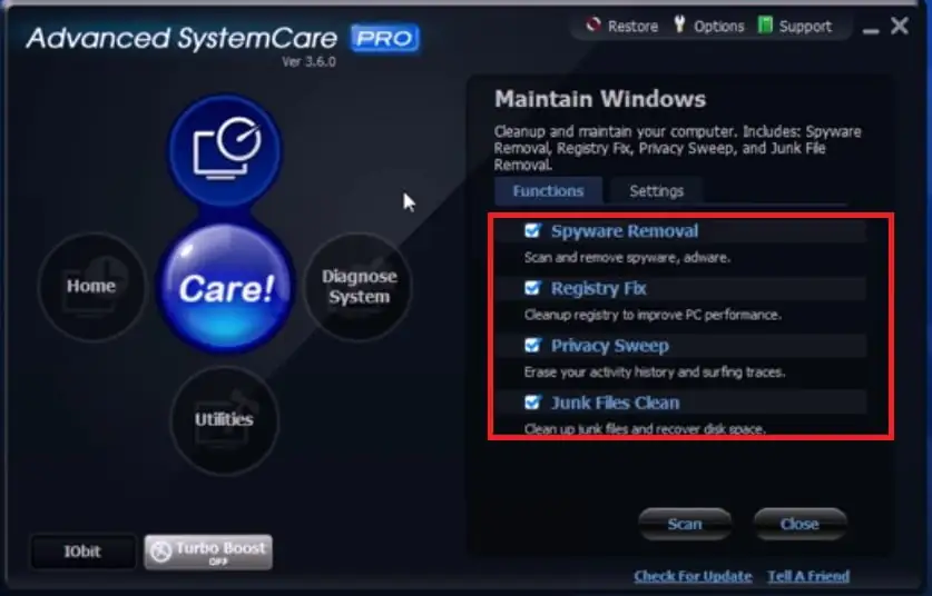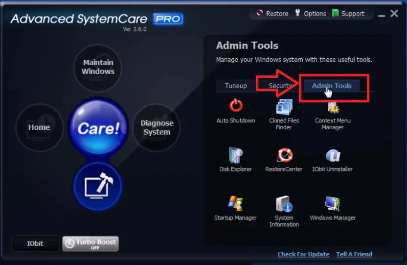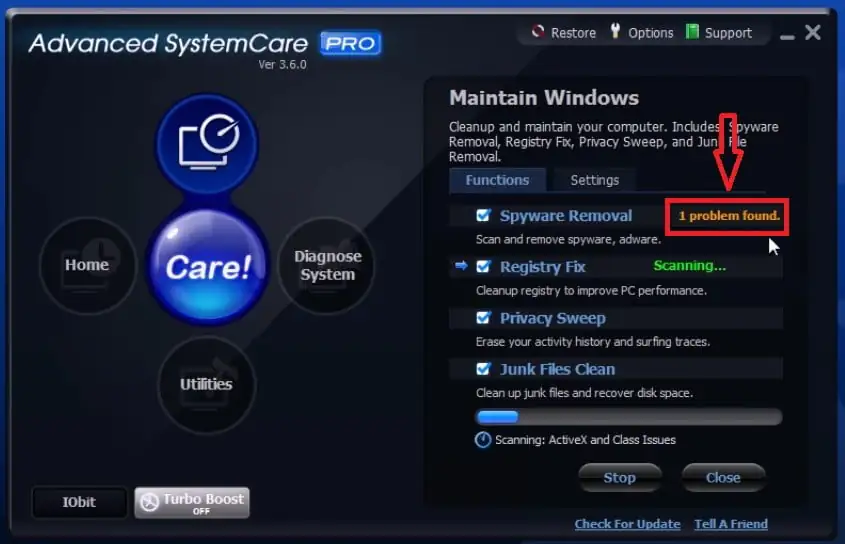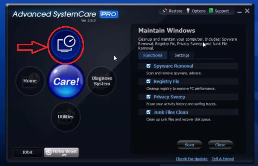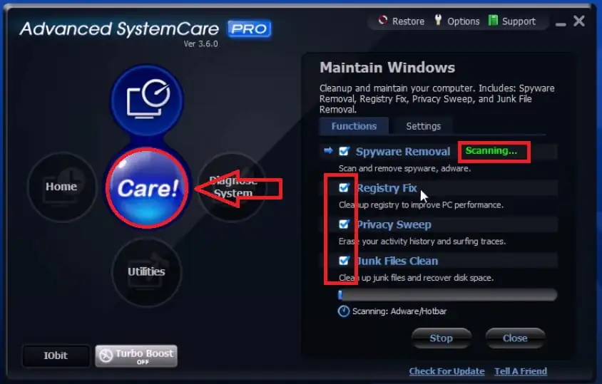 Bilgisayar checkup kontrolleri işlemlerinde ilk olarak işletim sisteminde Temizleme işlemi için, ekranın sol tarafında bulunan, “CARE!” butonuna tıklayıp, temizleme işlemlerimizi başlatıyoruz.