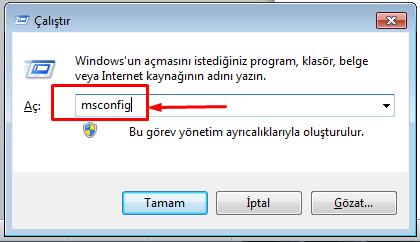 2. Açılan Çalıştır penceresinde Aç kutucuğuna msconfig kelimesini yazıp Tamam butonuna tıklıyoruz.