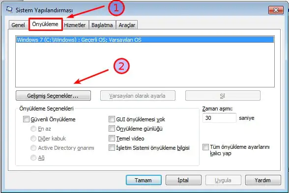 1. Sistem Yapılandırması penceresi açılacak. Bu pencerede Önyükleme sekmesine tıklıyoruz ve daha sonra bu sekmede bulunan Gelişmiş Seçenekler butonuna tıklıyoruz.