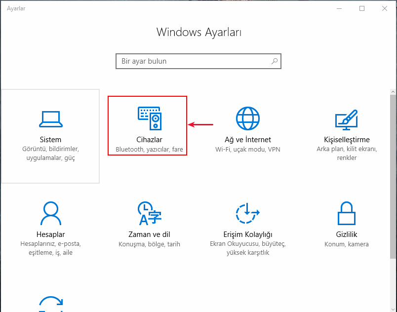 - Öncelikle blgisayarımızdan, sırasıyla Başlat → Ayarlar → Cihazlar menülerine tıklıyoruz.