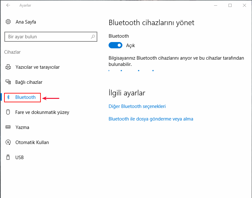 - Açılan sayfada sol tarafta bulunan Bluetooth menüsüne tıklıyoruz.
