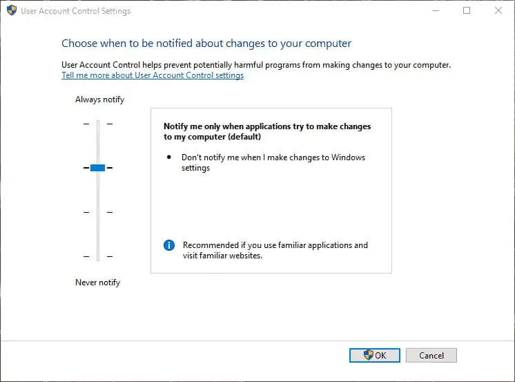 - UAC’yi tekrar açmak için kaydırıcıyı çubuğu yukarı sürükleyin. İsterseniz UAC’yi kapalı da bırakabilirsiniz.