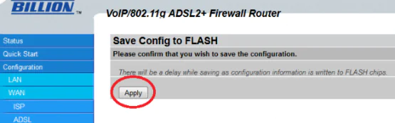 - Save Config to FLASH başlıklı sayfa gelecektir; bu sayfada direkt Apply butonuna tıklayınız ve ayarlarınızı kaydediniz. BILLION BiPAC 7404V modem kurulumu bitmiştir; internetinizde herhangi bir sorun yaşanır ise tekrardan yapılan düzenlemeleri kontrol etmeniz gerekmektedir; aksi halde internetiniz gelmeyecektir.