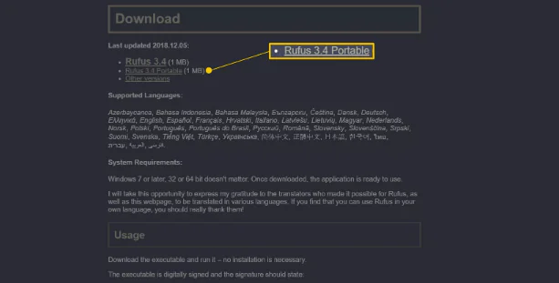 -Rufus taşınabilir bir programdır (yüklenmez), Windows 10, 8, 7, Vista ve XP’de çalışır ve sahip olduğunuz her tür USB depolama aygıtına bir ISO görüntü dosyası “yakar”. Sitelerinde “Rufus <version> Portable’ı” seçtiğinizden emin olun.