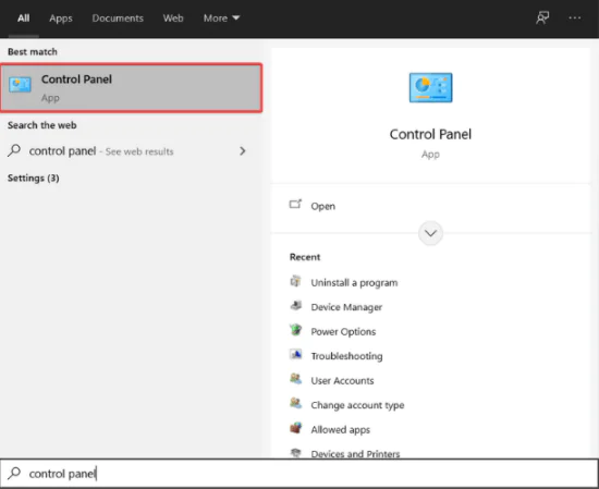 Arama çubuğuna gidin, Denetim Masası yazın ve Enter’a basın