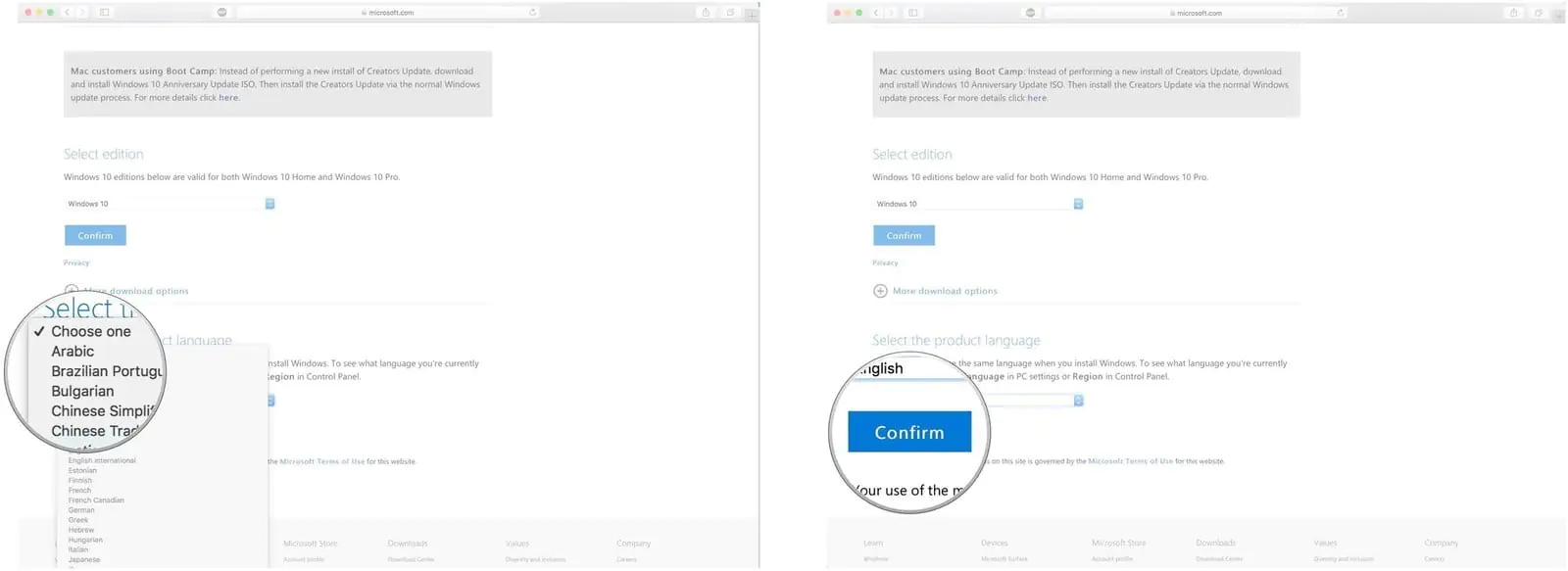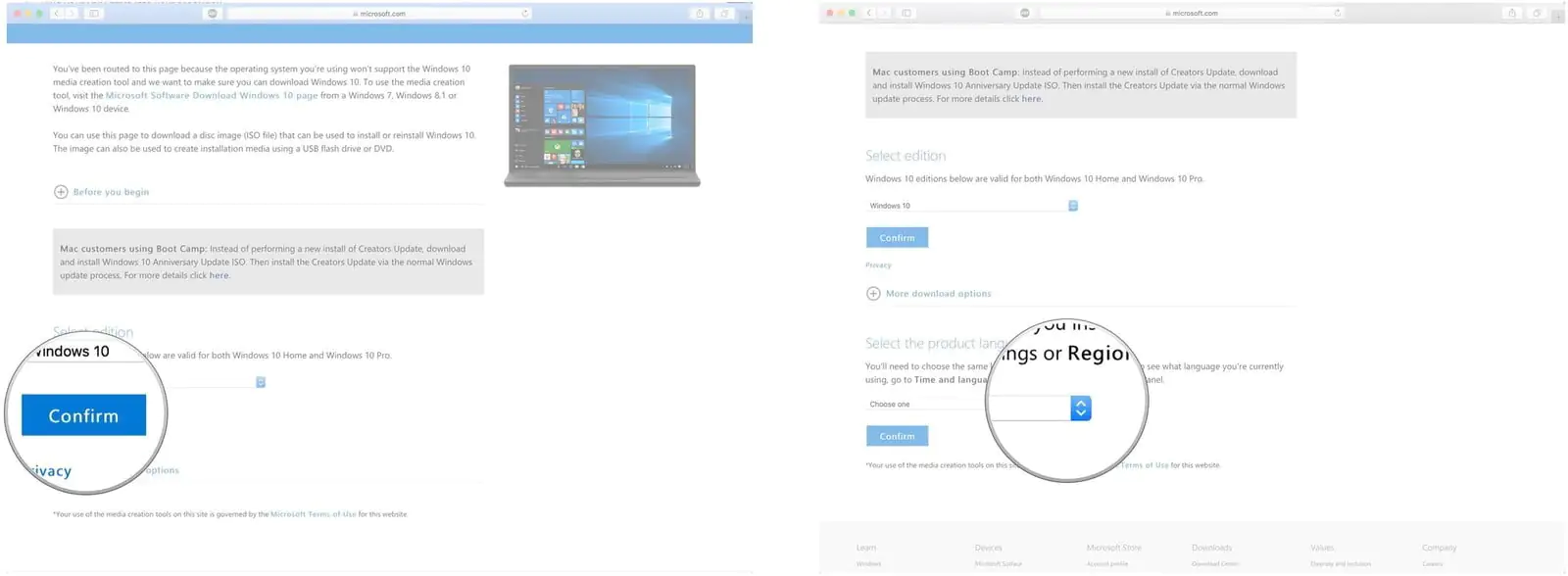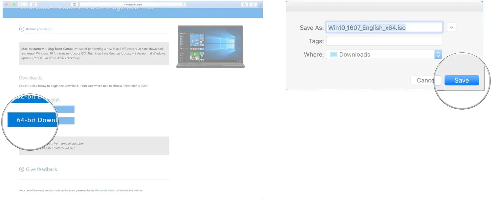 Kurulum için, Windows 10 ISO dosyasını Microsoft’un web sitesinden indirmemiz gerekiyor. Doğrudan Mac bilgisayarınızın (dahili) sabit sürücüsüne (hard diskine) indirebilirsiniz.