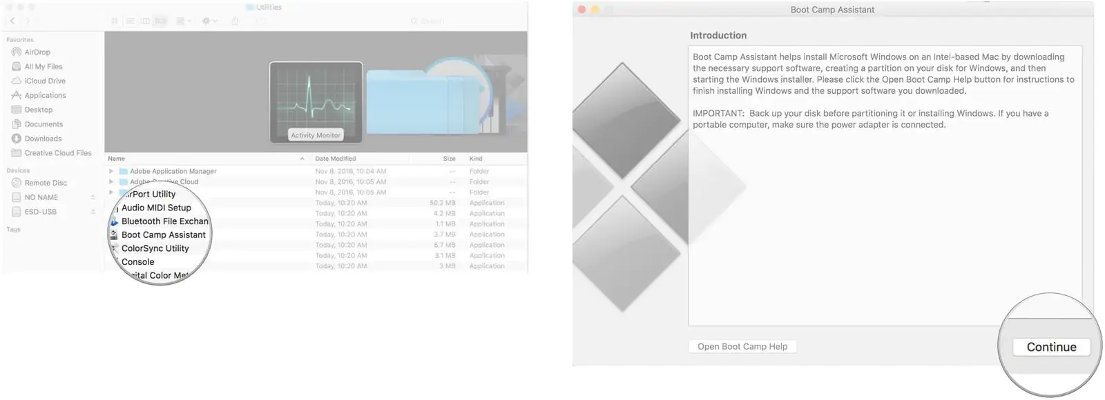 • ‘Uygulamalar (Applications)’ menüsünde ‘İzlenceler (veya Araçlar) (Utilities)’ klasöründen ‘Boot Camp Asistan (Boot Camp Assistant)’ı başlatın.