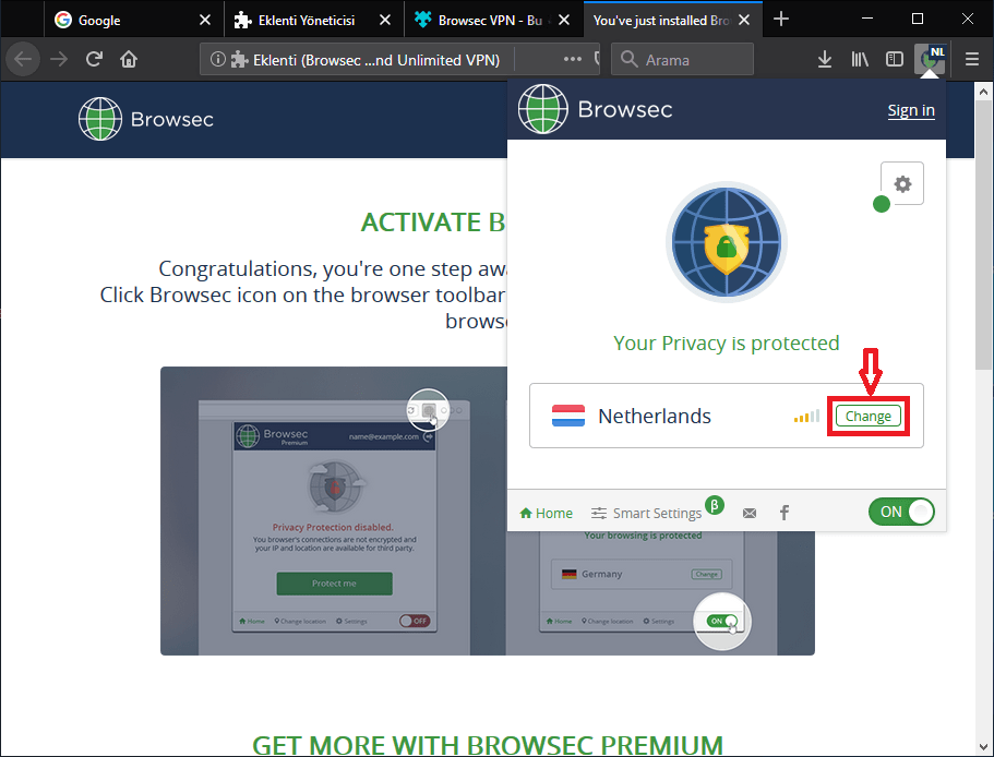 - Browsec VPN eklentisinin varsayılan VPN sunucu lokasyonu (konumu) ‘Hollanda (Netherlands)’dır. Yani, internete Hollanda üzerinden çıkıyorsunuz. İsterseniz ‘Change’ butonuna tıklayarak bu konumu değiştirebilirsiniz.
