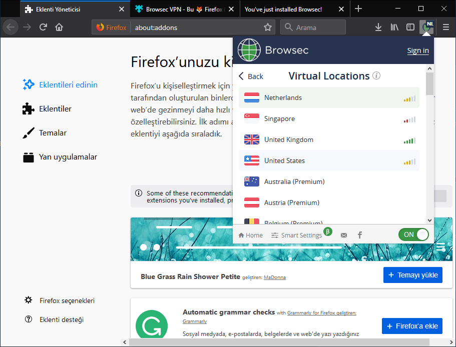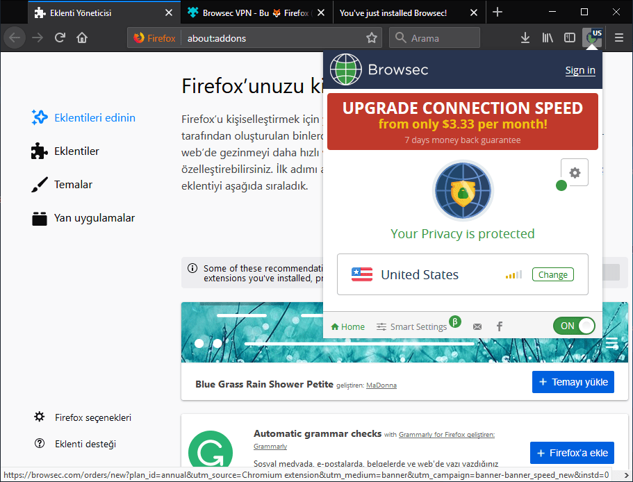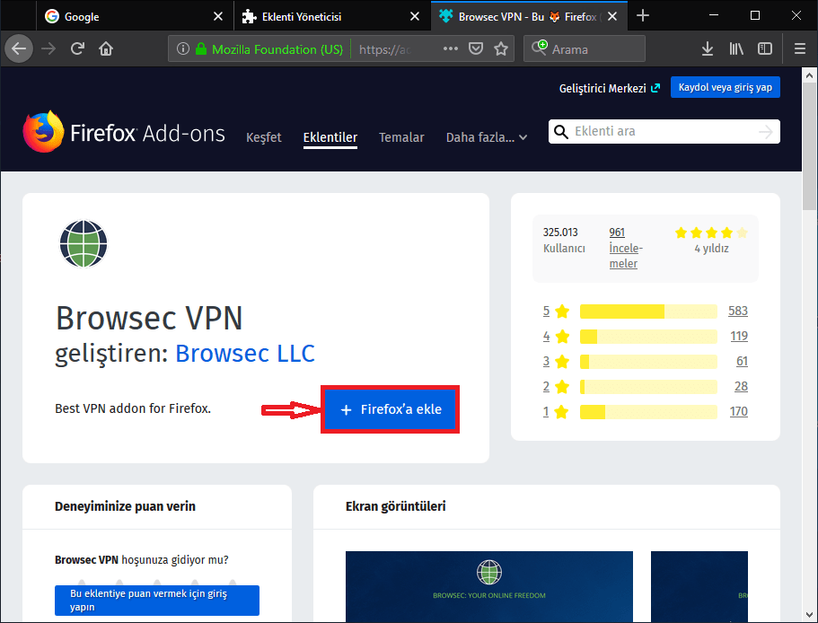 İnternet erişiminde sorun yaşama, başta sosyal paylaşım platformları olmak üzere bazı internet servislerine, sayfalarına erişememe durumunda ilk akla gelen çözüm VPN servisleri ve yazılımlarıdır. Bu makalemizde bu çözümlerden biri olan Browsec VPN çözümünün kurulumunu anlatacağız. Browsec VPN, bilgisyarlarda (Windows, macOS, Linux) tarayıcılara eklenti olarak kurulmakta. iOS ve Android cihazlarda ise uygulama marketlerinden ücretsiz olarak indirilebilmekte. Bilgisayarlardaki tarayıcılarda Microsoft Edge hariç tüm tarayıcıların eklenti mağazasında Browsec VPN bulunmakta. Bu makalemizde Mozilla Firefox tarayıcısında Browsec VPN eklentisinin kurulumunu anlatacağız. Diğer tarayıcılarda da aynı adımları uygulayarak kurulumu yapabilirsiniz.