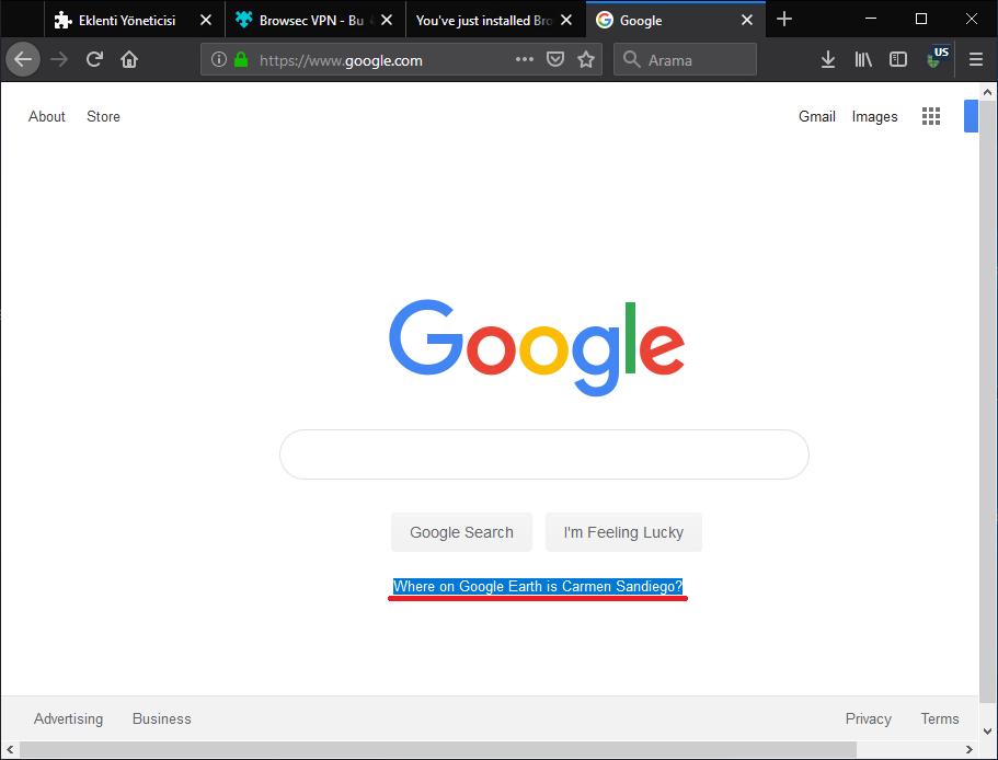 - Tarayıcının sağ üst köşesinde, Browsec VPN eklentisine ait dünya şeklindeki simgeye tıklıyoruz.