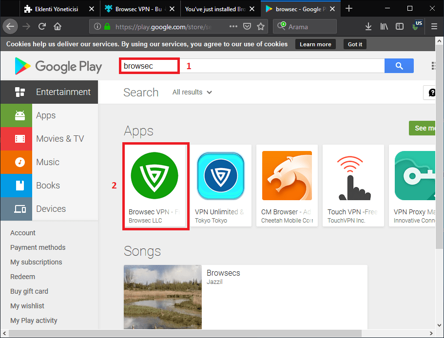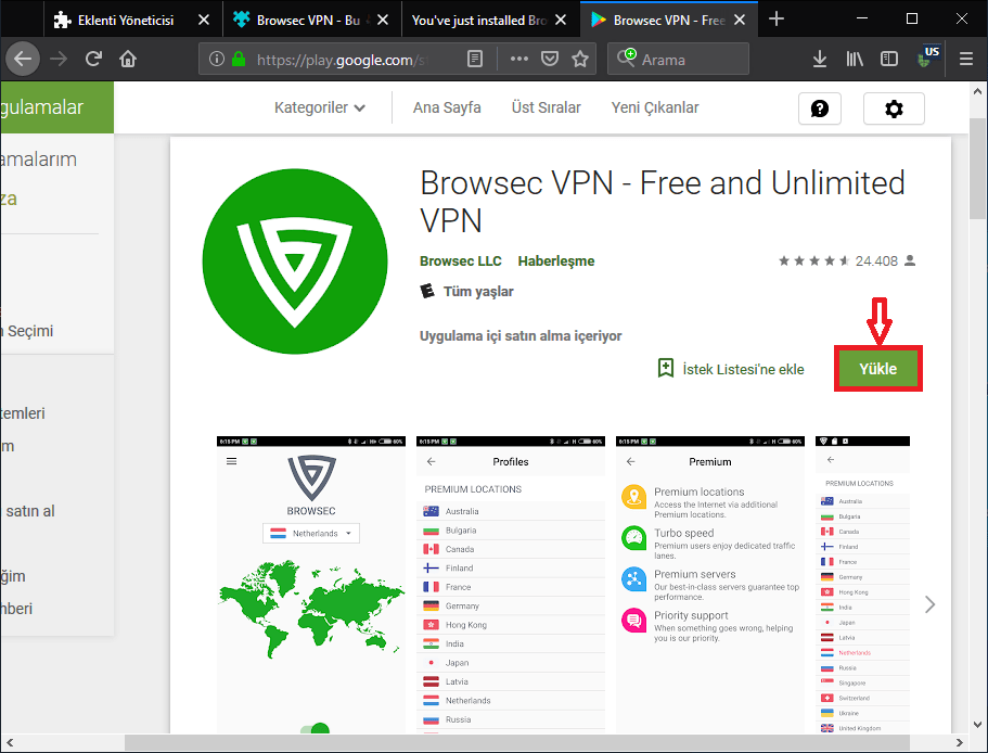 Android cihazlarda Google Play Store uygulama marketinde browsec yazıp aratarak Browsec VPN uygulamasını bulabilir ve yükleyebilirsiniz.