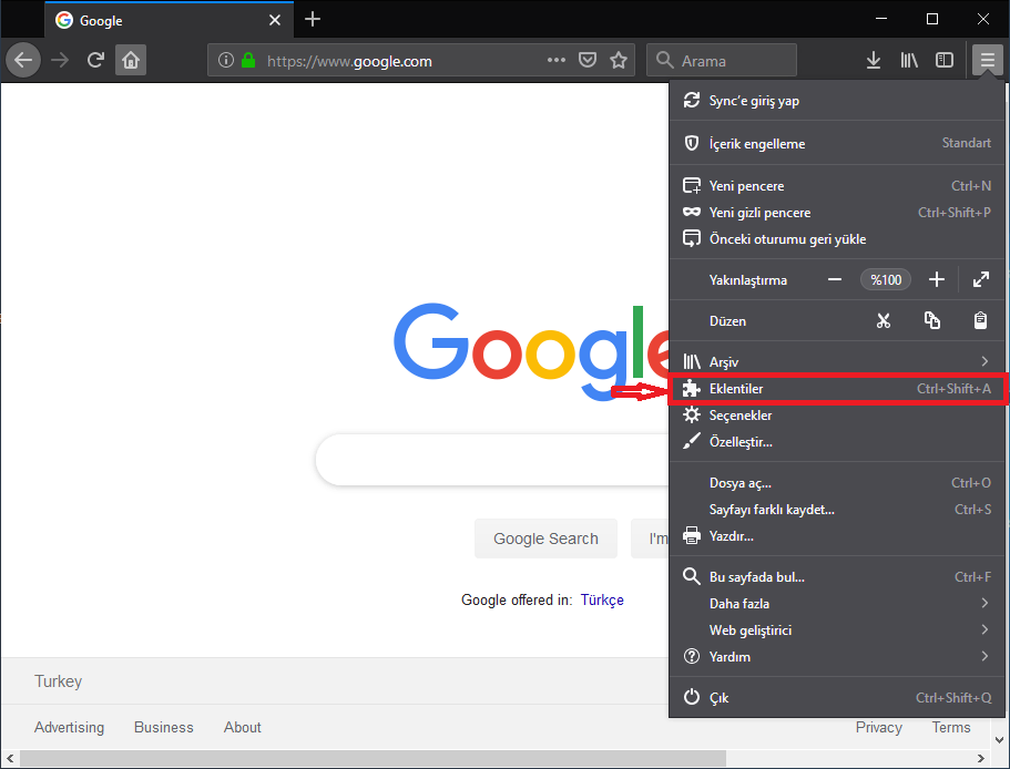 - Açılan menü listesi penceresinde ‘Eklentiler’ menüsüne tıklıyoruz.