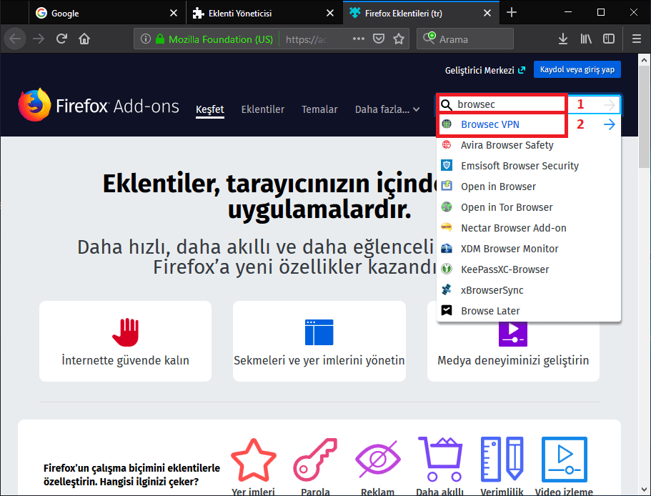 - Açılan sayfada arama kutucuğuna ‘browsec’ yazıyoruz ve arama sonuçlarından ‘Browsec VPN’ eklentisine tıklıyoruz.