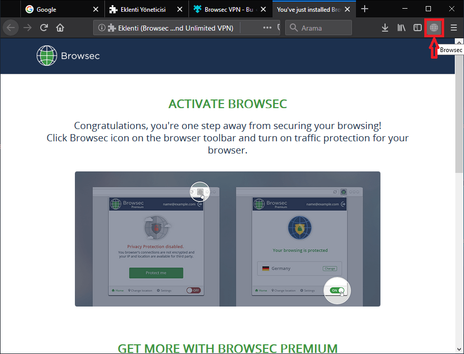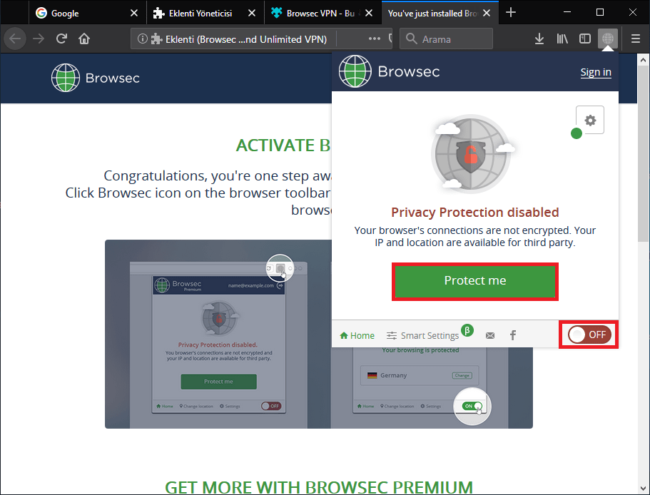 - ‘Protect me’ veya ‘ON/OFF’ butonuna tıklayarak eklentiyi etkinleştirebilirsiniz.