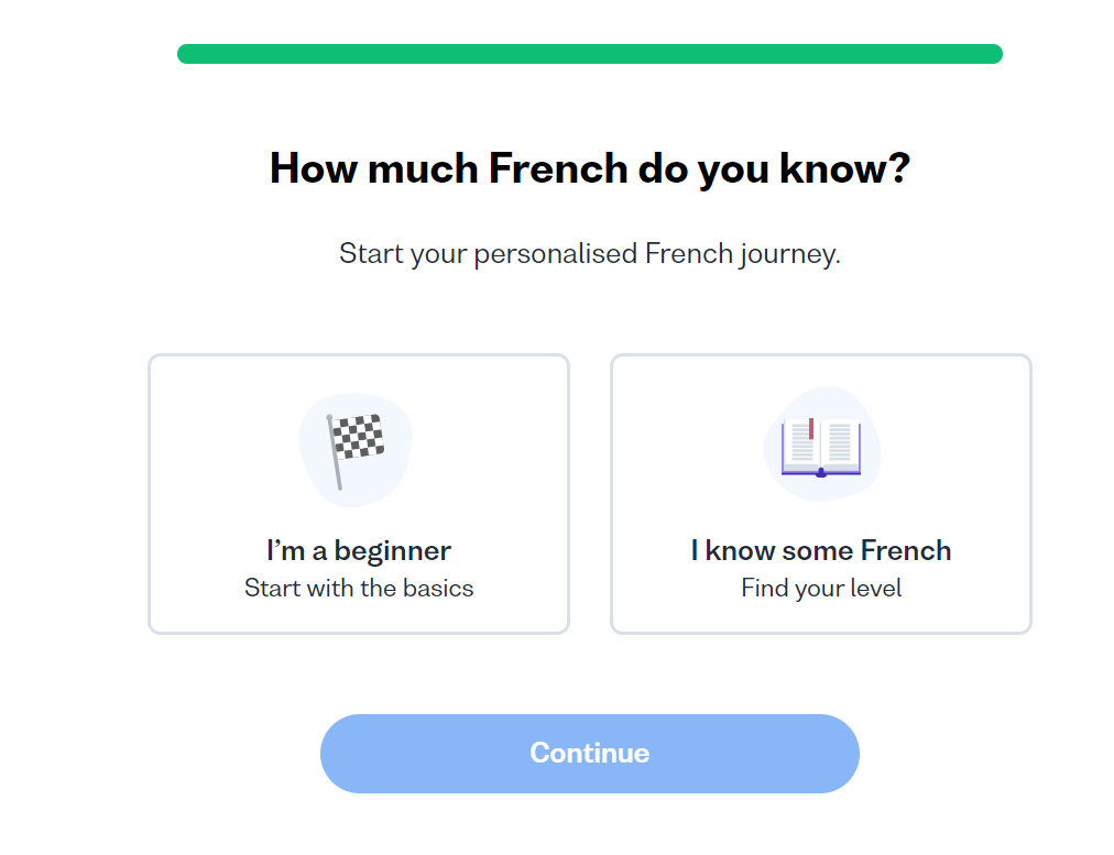 - Eğer daha önce seçtiğiniz dili öğrenmeye başladıysanız, başlangıç seviyenizi belirlemek için bir seviye tespit testi yapabilirsiniz. Eğer dili öğrenmeye yeni başlıyorsanız başlangıç seviyesini seçerek kurslarınıza başlayabilirsiniz.