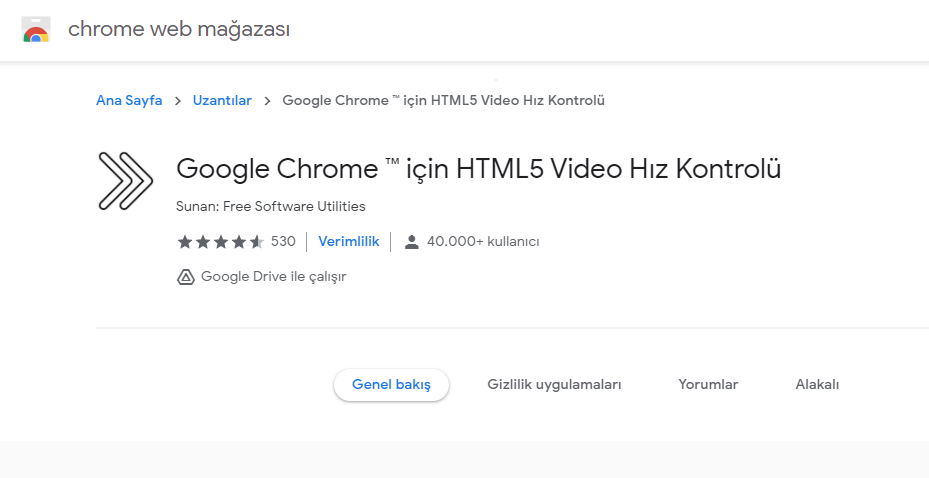 Karşımıza aşağıda bulunan görselde ki sayfa gelecektir. Bu sayfada genel bakış başlığı altında eklenti hakkında bilgi verilmektedir. Video hızlandırma eklentisinin Google’dan bağımsız bir eklenti olduğundan bahsedilmektedir. Ayrıca videoyu hızlandırabileceğiniz gibi yavaşlatabileceğinizden ’de bahsedilmektedir. Genel bakış başlıklı yazının hemen sağında bulunan ek bilgiler başlığı bulunmaktadır. Bu başlığın altında ise eklentinin boyutu, sürümü, güncelleme tarihi gibi bilgiler yer almaktadır. Bu bölüm pek bizi alakadar etmemektedir. Çünkü boyut olarak çok küçük bir boyuta sahiptir ve neredeyse bilgisayarınızda hiç yer kaplamayacaktır. . Ardından Google Chrome için HTML5 Video Hız Kontrolü yazısının hemen sağında bulunan yazıda Chrome’a ekle butonuna tıklamalısınız.