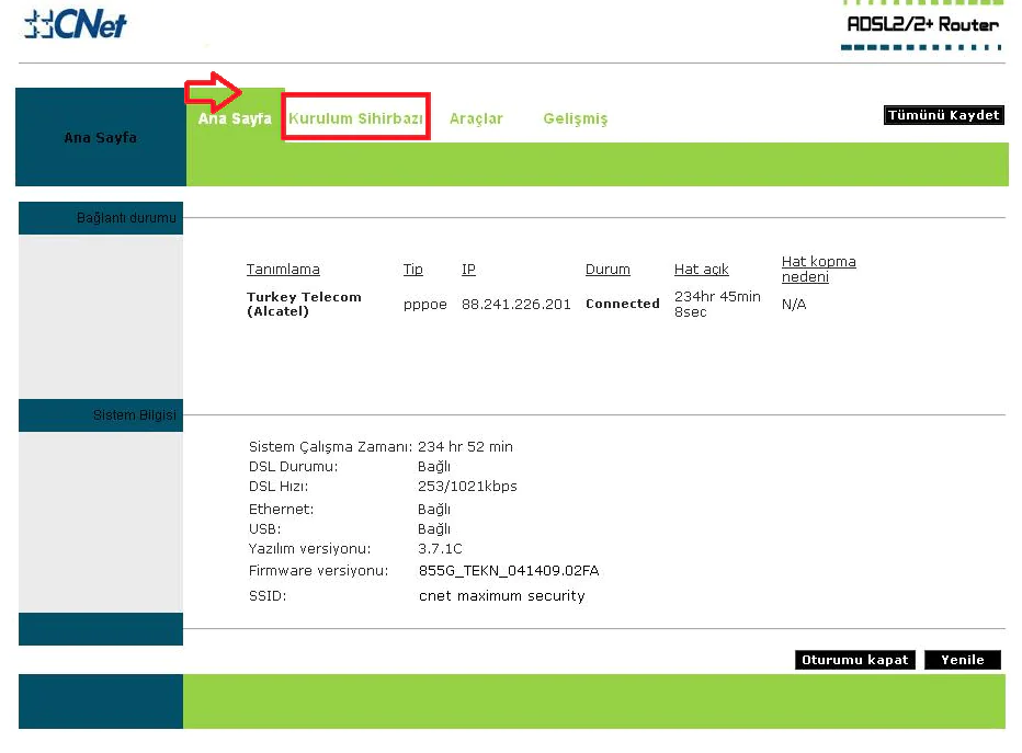 • Modem ara yüzüne giriş sağladıktan sonra ana sayfada üst kısımda bulunan menü sekmelerden ‘Kurulum Sihirbazı’ sekmesine tıklıyoruz.