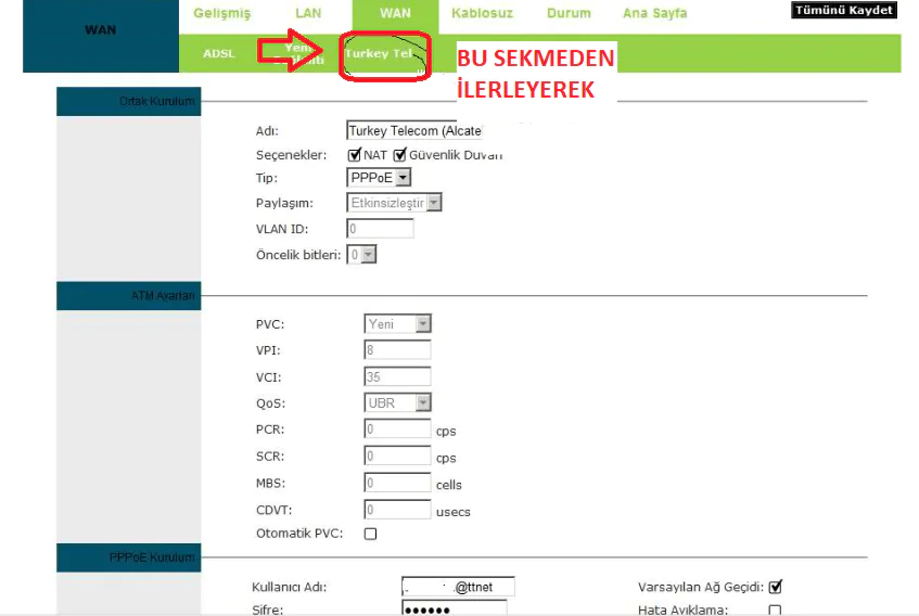 • Veya üst kısımda bulunan menüde WAN seçeneğine ve daha sonra da hemen alt kısmında bulunan ‘Turkey Telecom’ seçeneğine tıklıyoruz.