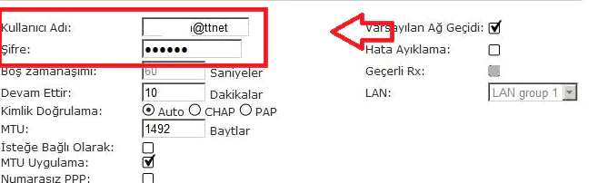 • Sayfanın alt kısmında bulunan ‘Kullanıcı Adı’ ve ‘Şifre’ kutucuklarına, servis sağlayıcınızdan aldığımız ADSL Kullanıcı Adı ve ve ADSL Şifre bilgilerinizi, domain uzantısı ile birlikte (@ttnet, @superonline, @vodafone, @dsmart, @turk.net, vb.), büyük harf küçük harf uyumuna dikkat ederek, ISS tarafından bize iletildiği gibi yazıyoruz.