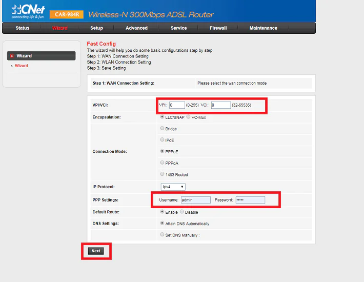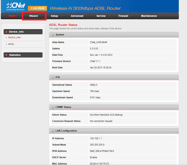 - CNET CAR 984R modem arayüzüne giriş sağladıktan sonra, sayfanın üst kısmındaki menülerden ‘Wizard’ seçeneğine tıklıyoruz.
