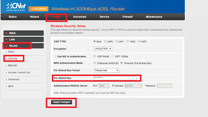 - Açılan sayfada ‘Pre-Shared Key (Ön-Paylaşımlı Anahtar)’ bölümüne en az 8, en fazla 64 karakterden oluşan ve Türkçe karakter içermeyen bir şifre yazıyoruz ve daha sonra, ekranın alt kısmında bulunan ‘Apply Changes (Değişiklikleri Kaydet)’ butonuna tıklıyoruz.