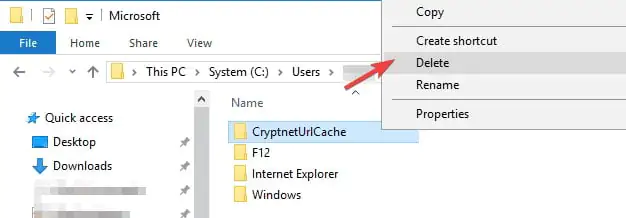 - Görüntülenen pencerede, CryptnetUrlCache klasörünü bulun ve sağ tıklayınız.