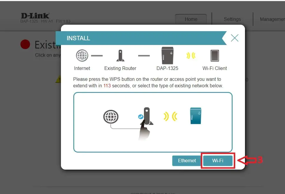 - Daha sonraki ekranda karşımıza ürün kurulum modu seçenekleri gelecektir. Ürünü, var olan bir kablosuz ağın yayın alanını genişletmek için kablosuz ağ genişleticisi olarak kullanmak istiyorsak, WiFi seçeneğiyle devam ediyoruz.
