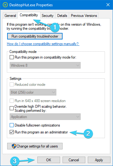- ”Run this program as an administrator” “ Bu programı yönetici olarak çalıştır” kutusunu işaretleyin ve değişiklikleri onaylayınız.