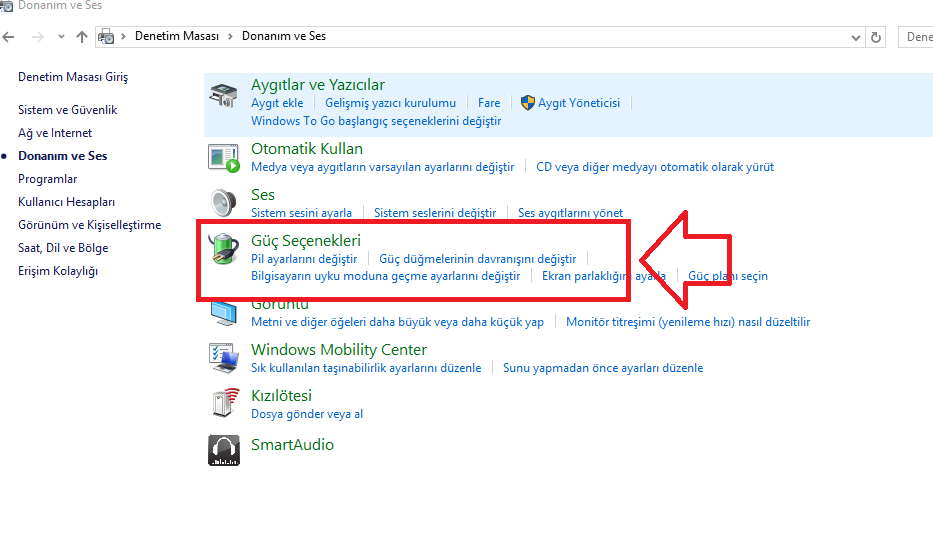 • Açılan pencerede ‘Güç Seçenekleri’ menüsüne tıklayalım