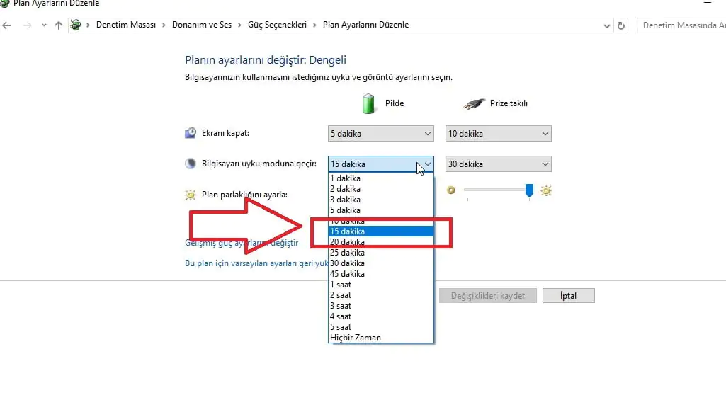 • ‘Bilgisayarı Uyku Moduna Geçir’ bölümünden ise, bilgisayarın uyku moduna geçmesi için, kullanımda olmadığı süreyi belirleyebilirsiniz.