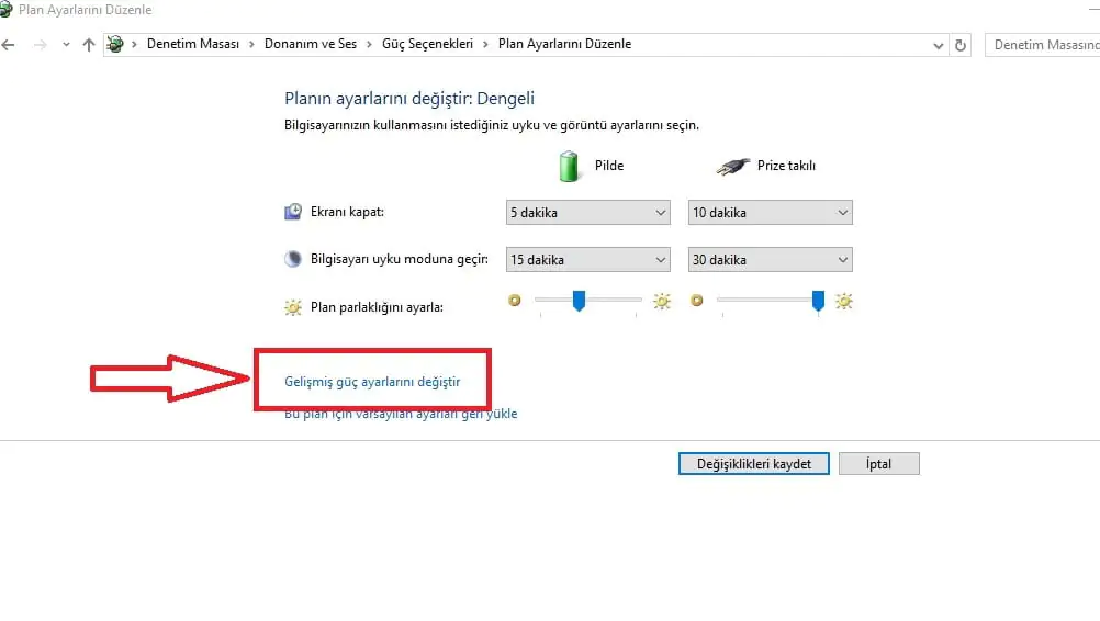 • Açılan pencerede orta kısımda bulunan, ‘Gelişmiş güç ayarlarını değiştir’ linkine tıklayıp işlemlerimize devam ediyoruz.