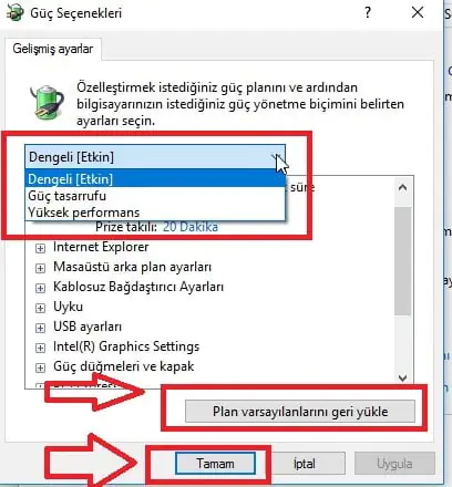 • ‘Güç seçekleri’ ayarlarını, varsayılan ayarlara döndürmek istiyorsanız ‘Plan varsayılanlarını geri yükle’ butonuna tıklayayıp, varsayılan ayarlara (fabrika ayarları) döndürebilirsiniz.