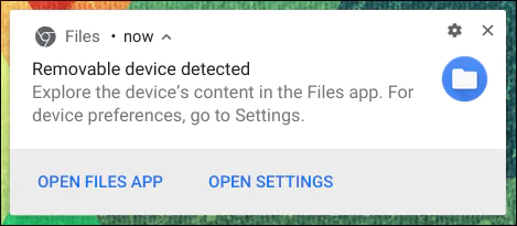 Önce, Chromebook’unuza bir USB flash sürücü takın. “Çıkarılabilir Aygıt Algılandı” yazan bir bildirim göreceksiniz.