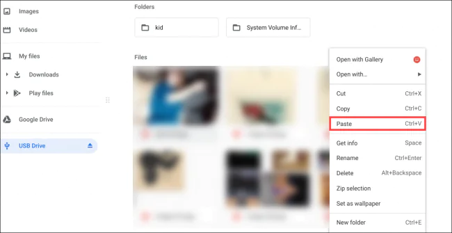 USB Sürücü penceresinde boş bir alana sağ tıklayın ve ardından “Yapıştır” seçeneğini seçin.