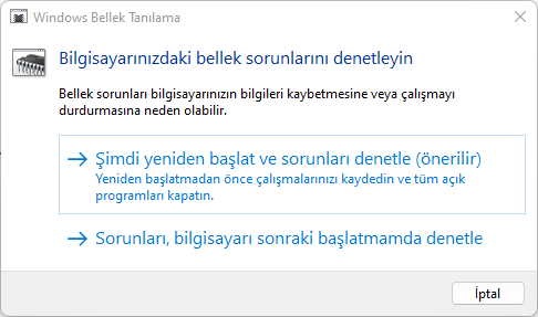 Başlat menüsüne Windows Bellek Tanılama yazarak aracı açın. Açılan sayfada Şimdi yeniden başlat ve sorunları denetle (önerilir) seçeneğine tıklayın.