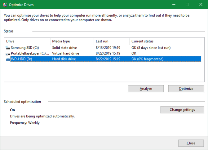 Bunu yapmak için Başlat Menüsü’ne “birleştirme” yazın ve “Sürücüleri Birleştir” ve “Optimize Et” girişini tıklatın. Sürücünün son birleştirilmesinden bu yana bir süre geçmişse, bunu yapmanız gerekir.
